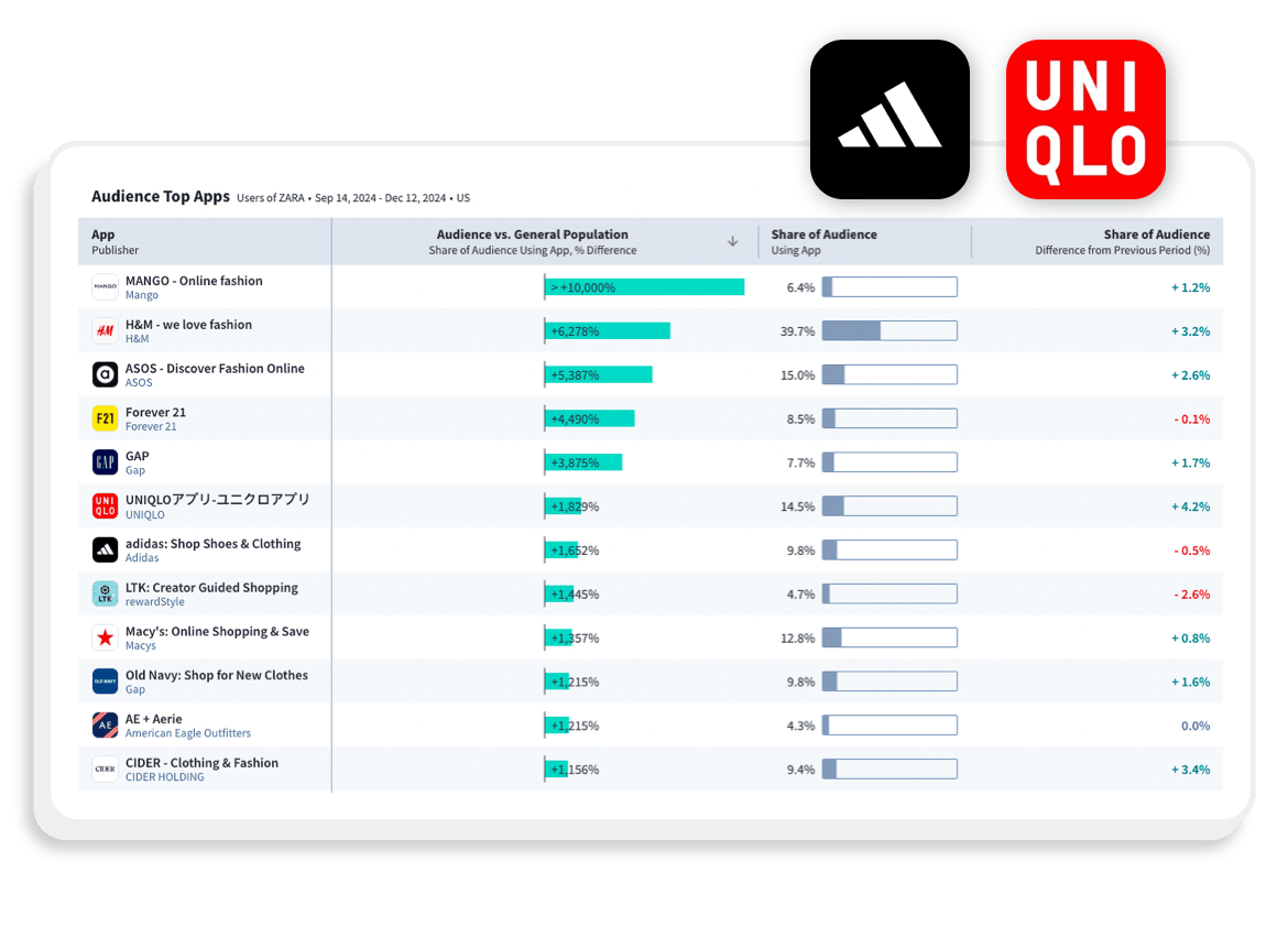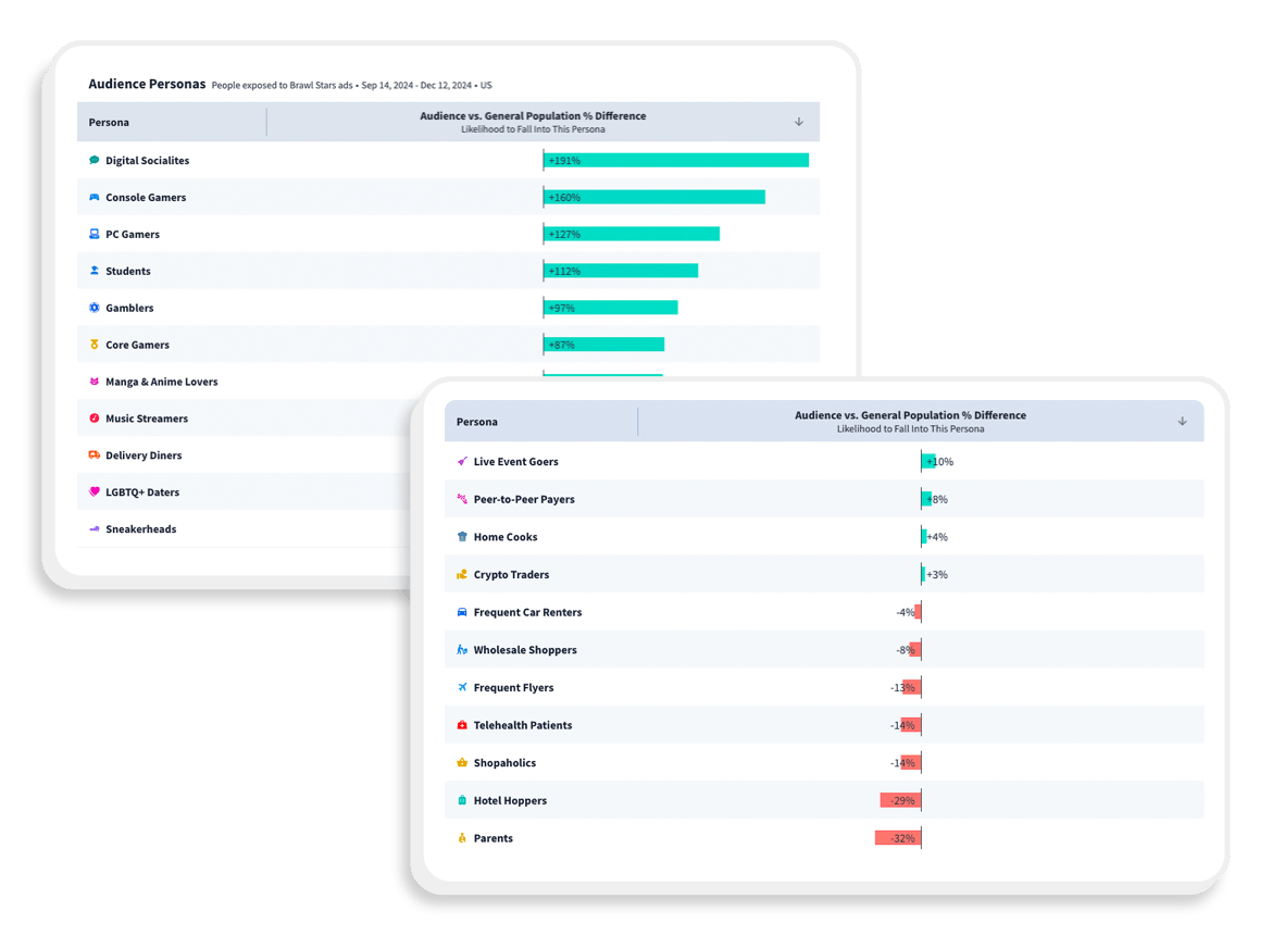 See the demographics of your competitors’ app users and the ads they viewed, personas that make up their user base, the advertisers targeting them on social media, and the other apps they’re using.