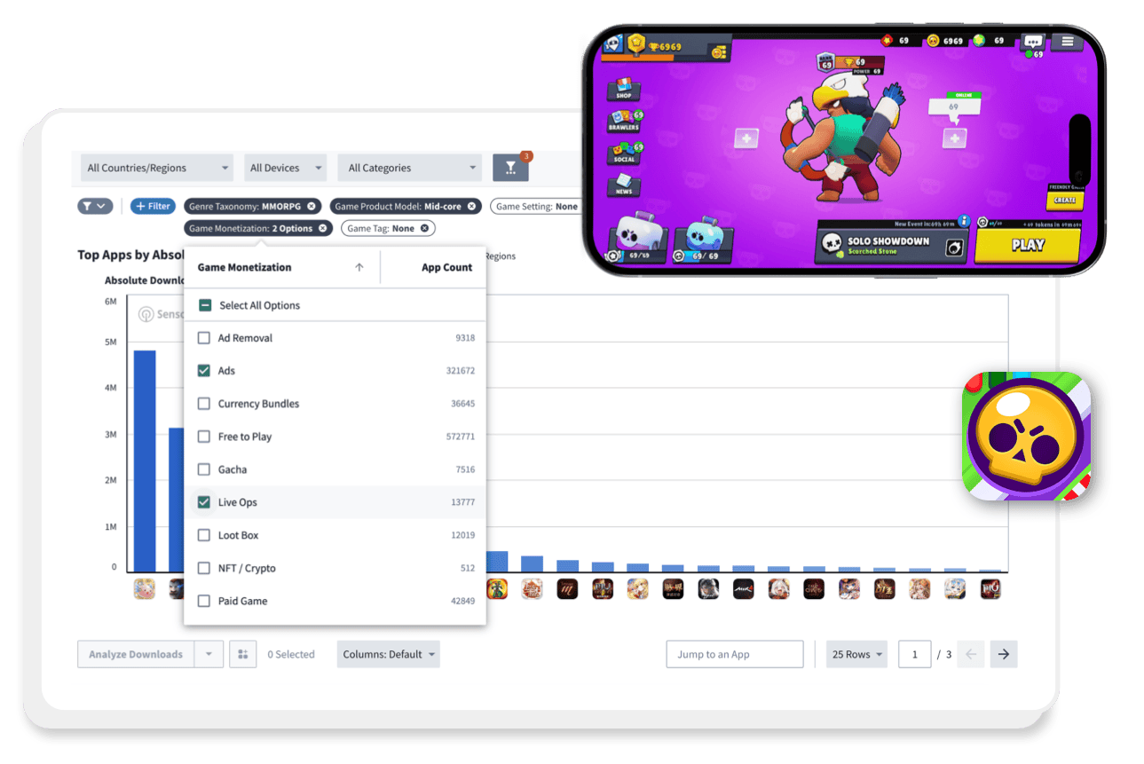 Seamlessly track trends with specialized alerts on the latest game releases, new content, and live-ops events. Utilize unique game intel descriptors to zero-in on key elements for top-performing games, or surface the critical markets driving downloads and revenue to identify the category and market leaders at the game and publisher level.