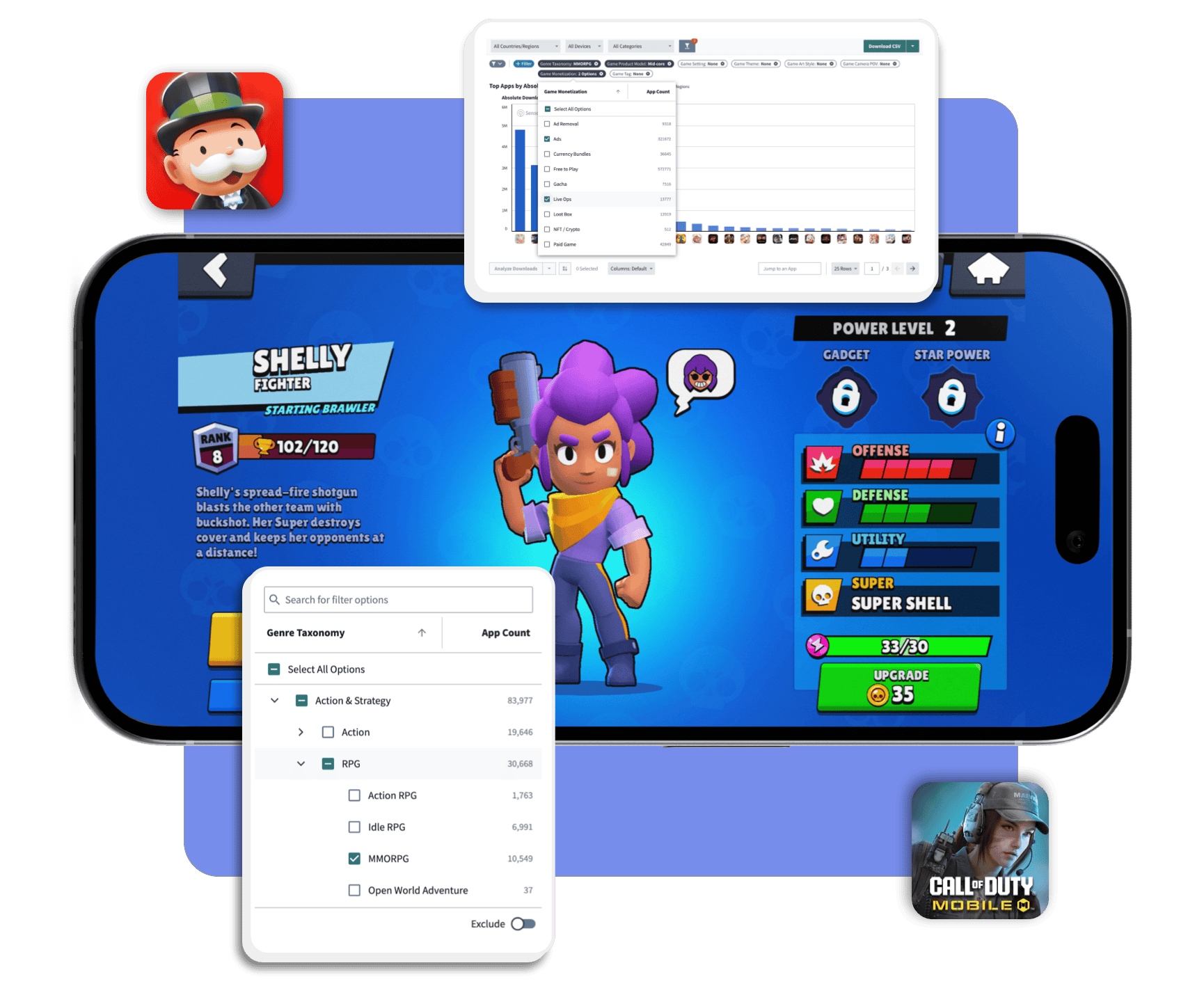Analyze games down to the sub-genre level with the best Game IQ on the market and a dedicated dashboard. Quickly identify top games with a specific mechanic, for example, and view downloads and revenue generated during a selected period for games in both the App Store and Google Play.