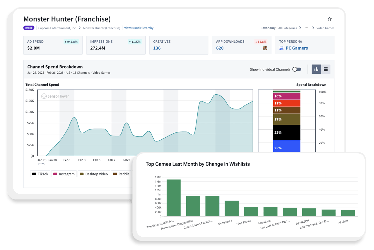 Use Pathmatics Digital Advertising Insights product to track where and how top mobile games are advertising - from ad spend and channels to actual creatives. See what’s working for AA and AAA titles across paid campaigns, and use those insights to shape your own UA strategy. For organic growth, our App Store Optimization reports help identify the keywords and trends that improve visibility in the app stores. If you’re launching or tracking Steam games, VGI’s wishlist and revenue metrics show which titles are gaining traction - and how yours stacks up.