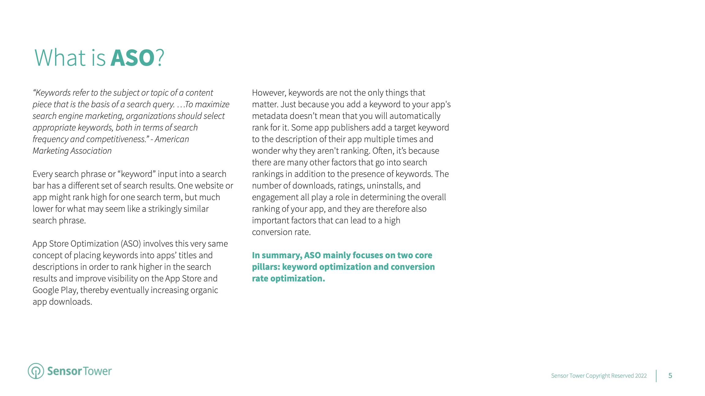 In summary, ASO mainly focuses on two core pillars: Keyword Optimization and Conversion Rate Optimization.