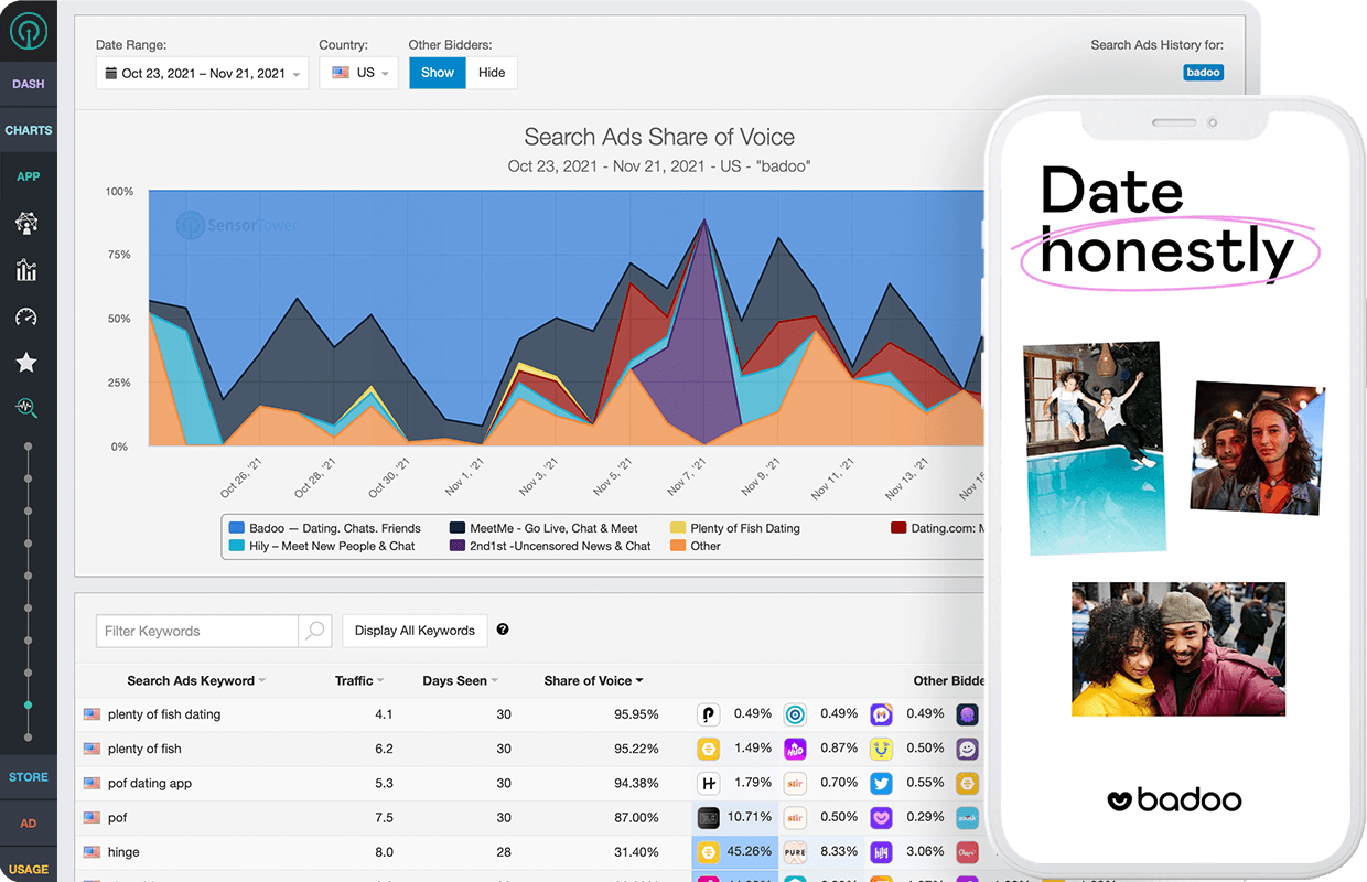 Mobile behaviors critically drive marketing programs, but in the wake of changes to Identifier for Advertisers (IDFA), more metrics are needed to fill in the gaps. Create a Custom Dashboard within Sensor Tower that places ad performance alongside downloads and revenue to clearly see how competitors are benefitting from different targeting practices, or set up Custom Alerts for when a creative hits an exceptionally high Share of Voice. Sensor Tower’s data makes it easy to develop an agile ad program without IDFA.