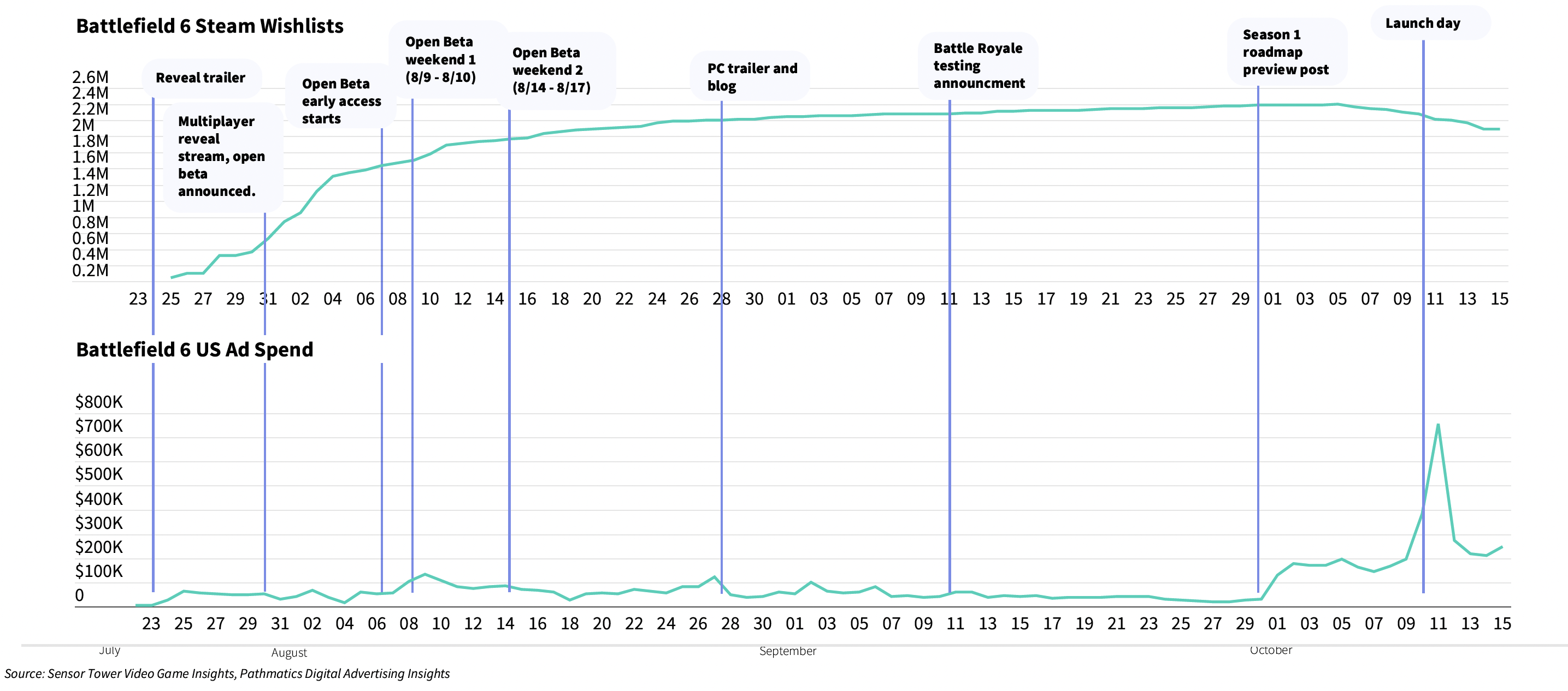 Zooming in on the current zeitgeist, Battlefield 6 ran what looks to be a flawless launch campaign, becoming the first legitimate challenge to Call of Duty in years. The reveal trailer showcased core Battlefield differentiators (battlefield scale, vehicles alongside infantry, and environmental destruction), activating the franchise audience. Next, was a viral content creator-fuelled open beta that delivered on gameplay. Cadence was strong, keeping audience attention from reveal to launch. Battlefield 6 soared from nothing to over 2 million Steam wishlists in a few short weeks, with advertising timed to marketing beats.