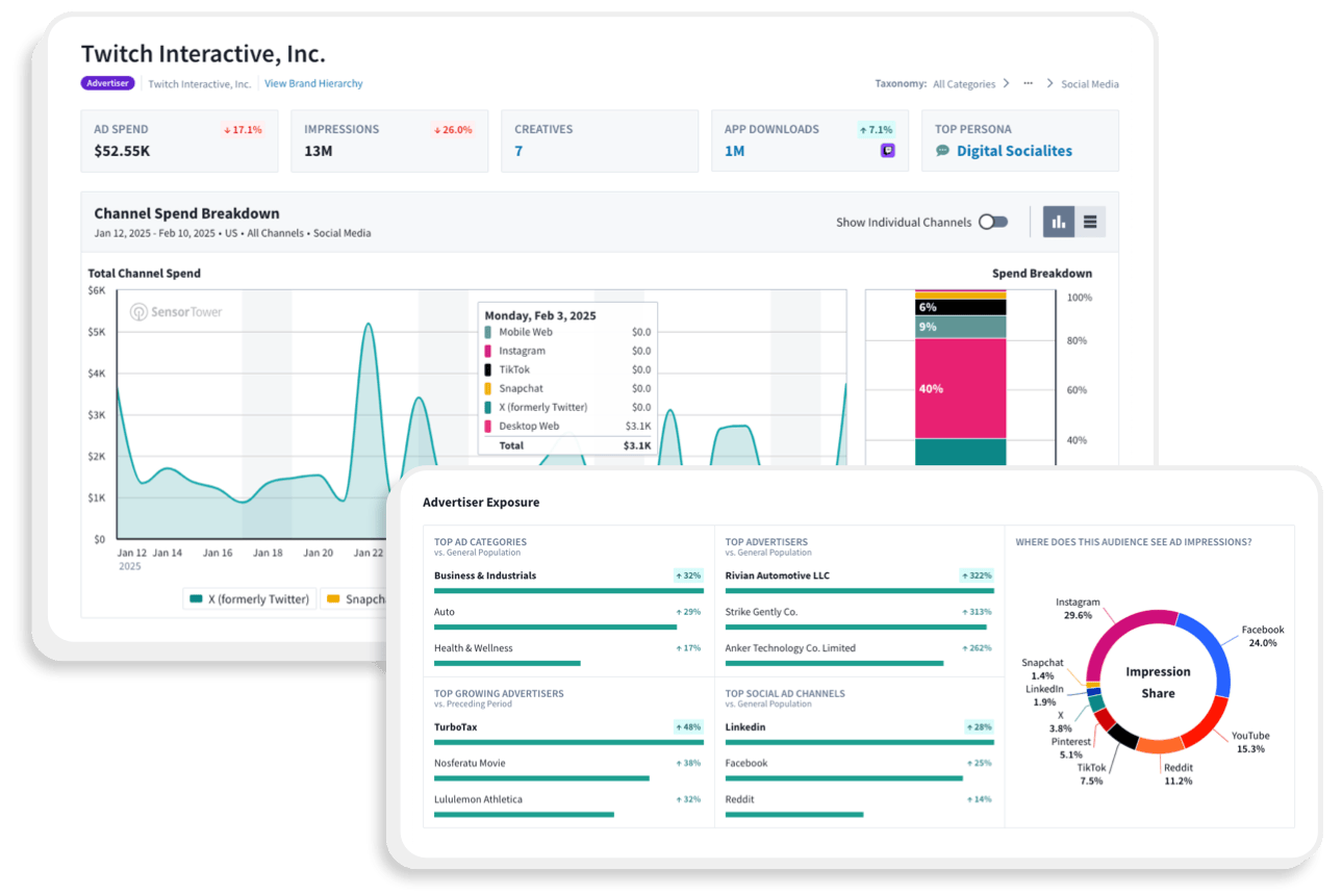 See how top advertisers on your platform allocate their ad budgets to your competitors and identify opportunities to gain share of wallet. Gain a holistic view of the market and its revenue potential and identify opportunities for innovation and growth. Be informed of macro trends for advertising across TikTok, Facebook, Instagram, X, Threads, and more in order to plan your selling strategy.