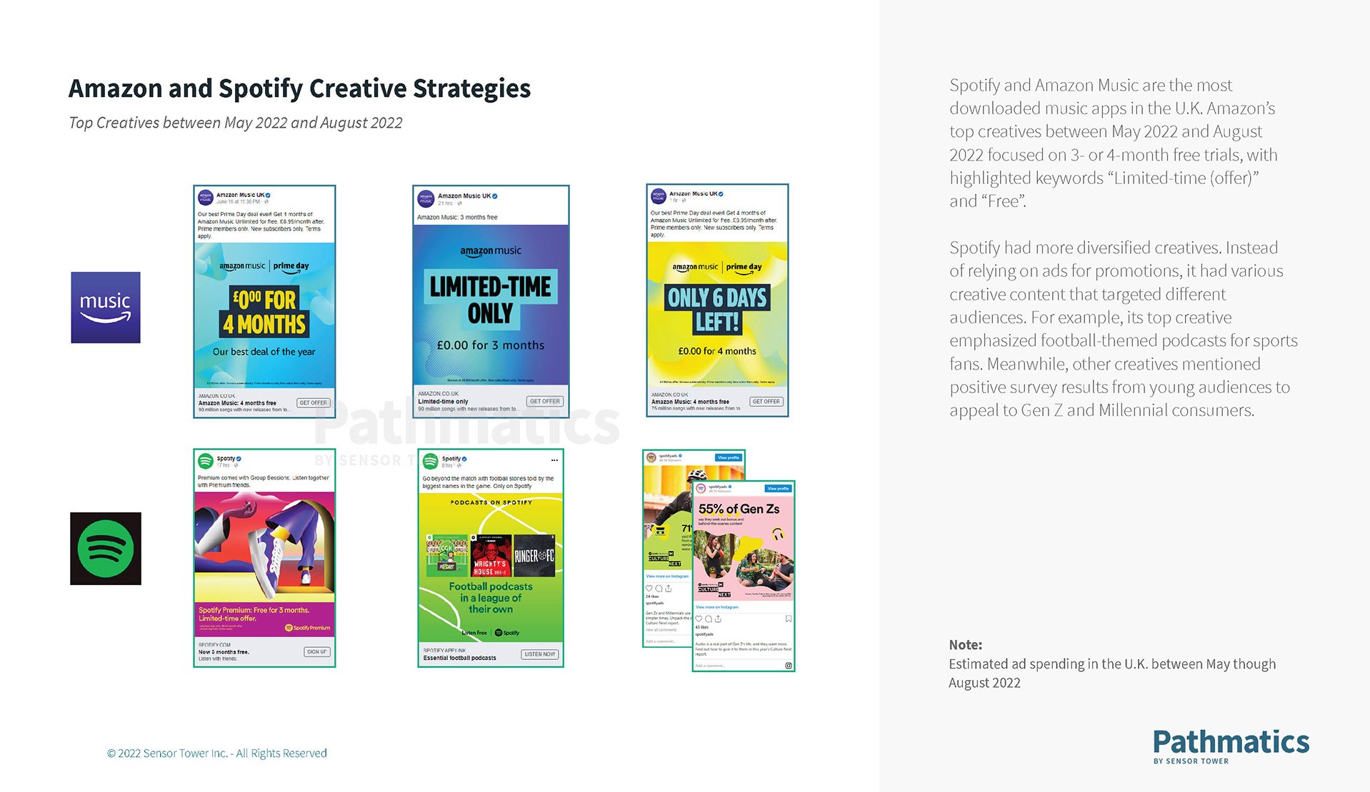 Spotify and Amazon Music have been the most downloaded music apps in the U.K. since 2019, according to Sensor Tower Store Intelligence data. However, these two brands have executed very different social ad strategies so far in 2022. Facebook was a major ad channel for Amazon Music, with 88 percent of its budget dedicated to the channel, and another 11 percent of its budget went toward Instagram. Spotify allocated its ad budget more evenly across four separate social channels: 45 percent on Instagram, 20 percent on Facebook, 18 percent on Snapchat, and 17 percent on TikTok. Spotify tended to use Story type posts, which represented 50 percent of its total ads on social platforms.