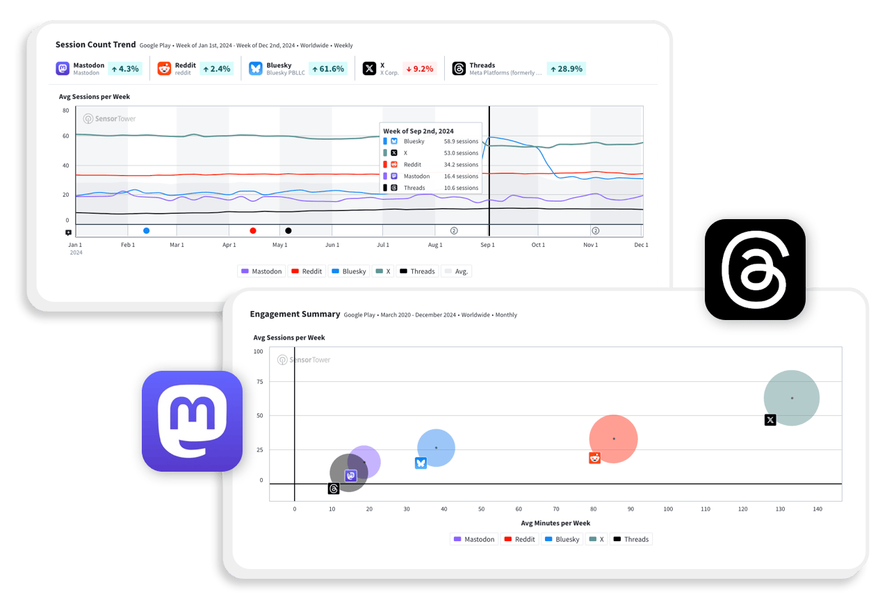 Explore user behavior trends across mobile categories—from social networks to SVOD and gig apps. Compare time spent, session counts, and performance over time to see real-world engagement for major players.