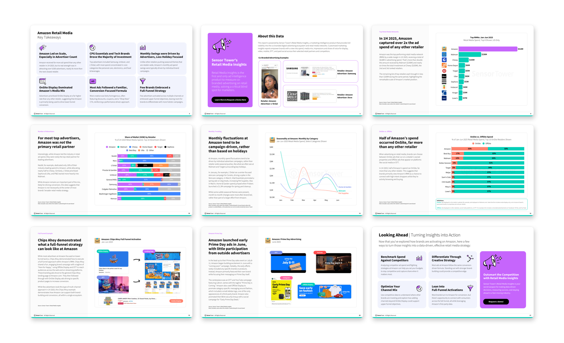 Amazon has quickly become the top performing Retail Media Network, and it’s not even close. Our latest report, showcasing Sensor Tower’s Retail Media Insights, details how advertisers are showing up, what brands and categories are topping the list, and how Amazon’s RMN is being utilized across the full marketing funnel.