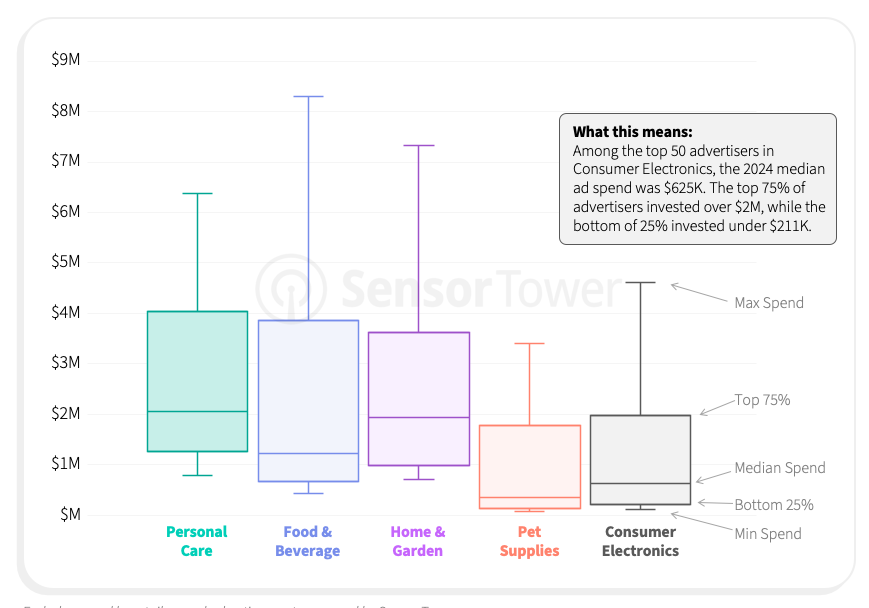 In 2024 the median spend among the top 50 Personal Care advertisers was $2M, while the median in Food and Beverages was $1.2M. Knowing your category and what competitors are spending is a great starting point to help you set realistic budgets based on competitive positioning and market ambitions. In Food and Beverages, for example, the top 25% of brands spent over $3.8M, while the bottom 25% invested less than $671k.