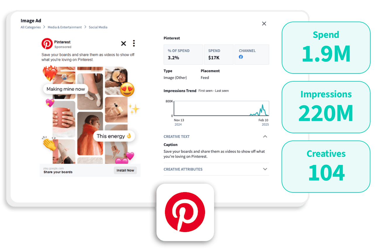 Identify top-spending brands that aren’t yet advertising on your social media network, and use detailed insights into their ad campaigns to pitch and win their business. Evaluate their spending strategy and highlight how you can help them expand their reach. Analyze specific brands’ ad creatives and seasonal campaigns to effectively tap into their goals.